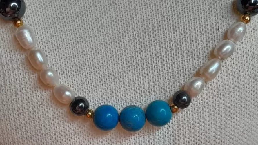 Colar Howlita Turquesa Pérola Hematita Artesanal Exclus C758