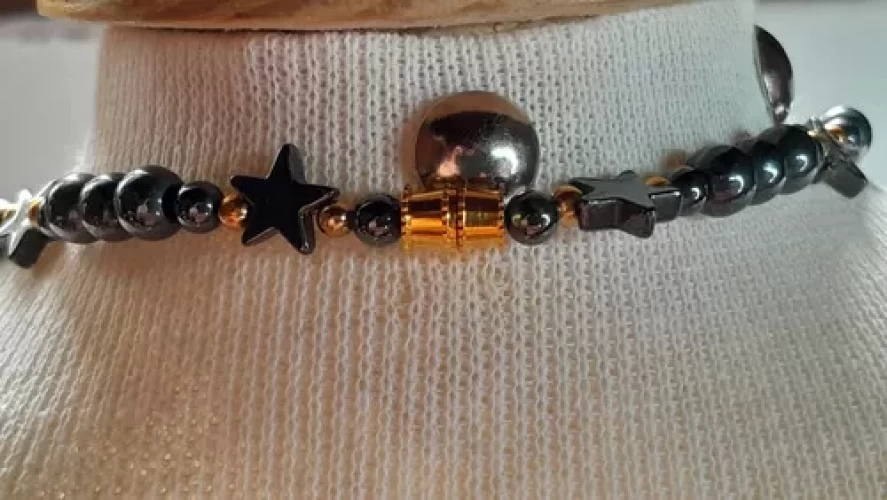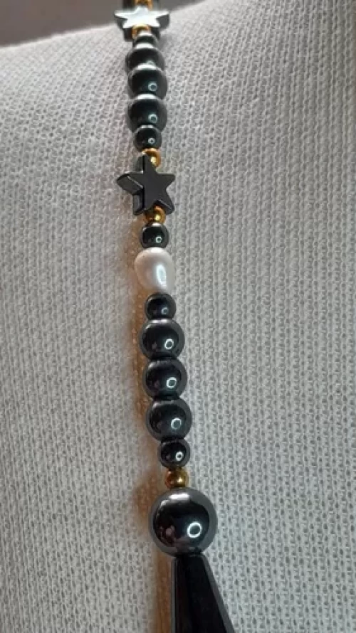 Colar de Howlita Tingida Turquesa Pérolas Naturais Barrocas e Hematitas Metálicas 3mm, 4mm 8mm Estrelinha e Entremeios. Peça Única Exclusiva Confecção Própria Artesanal.