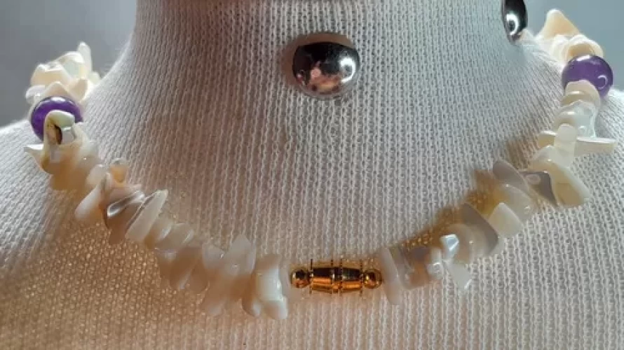 Colar de Ametista Lapidada 8mm e Madre Pérola Cascalho. Peça Única Exclusiva Confecção Própria Artesanal.