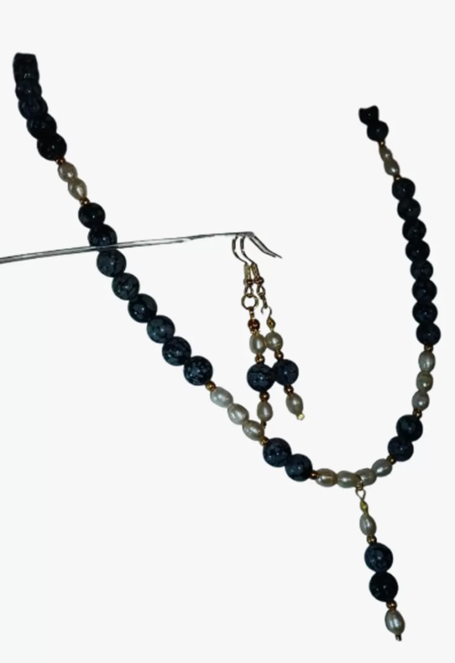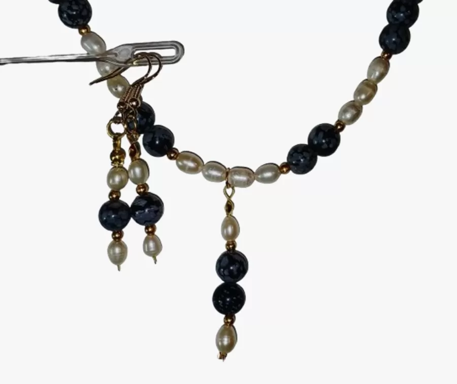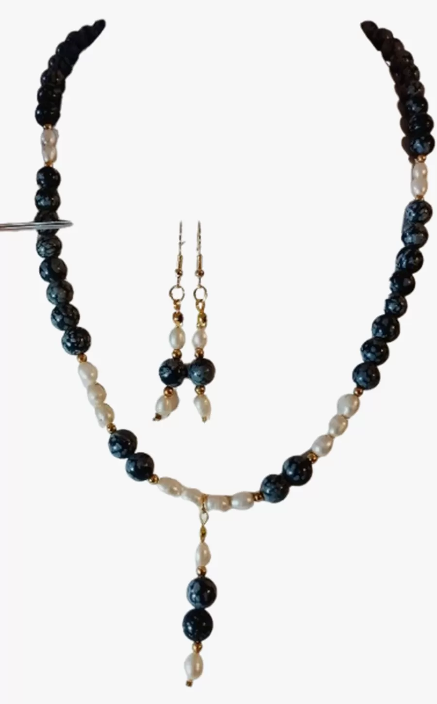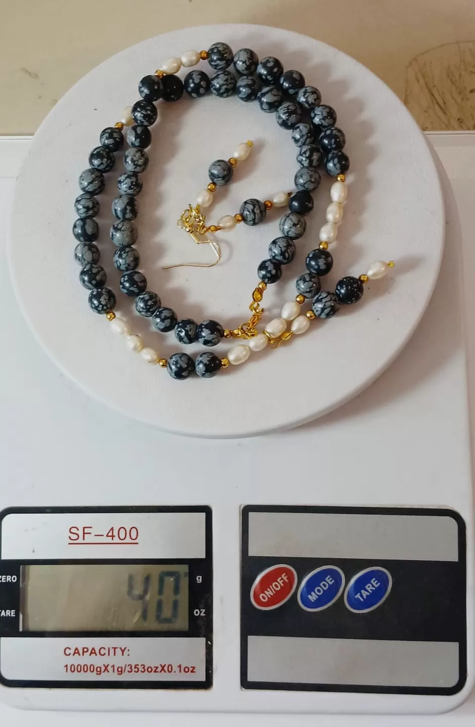 Colar Obsidiana/Howlita Flocos de Neve (Snowflake) e Pérolas Naturais de água Doce.