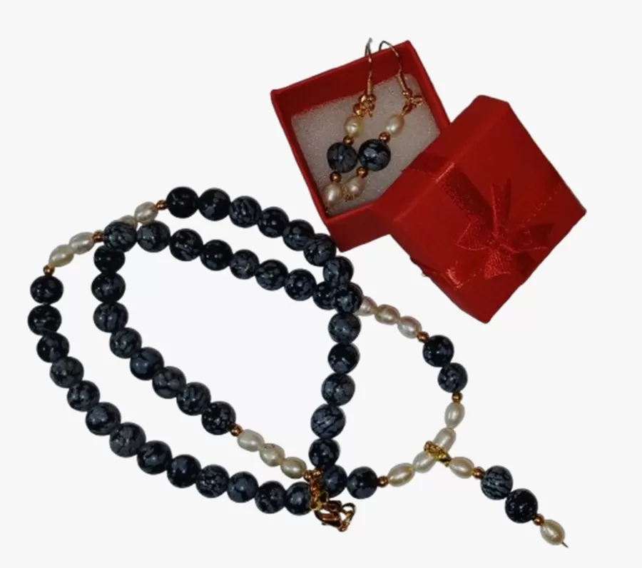 Pedras: Obsidiana/Howlita Flocos de Neve (Snowflake) e Pérolas Naturais de água Doce.