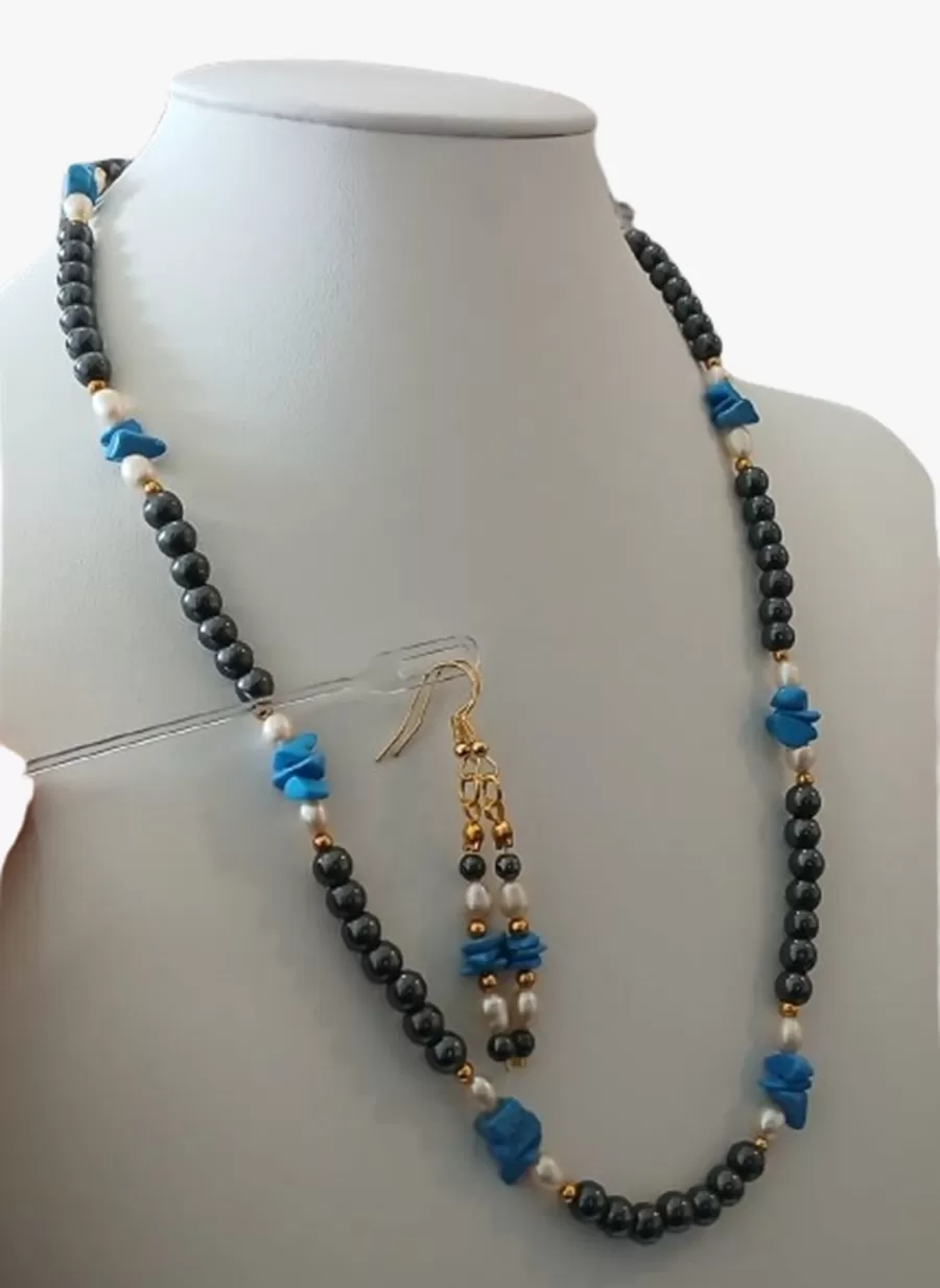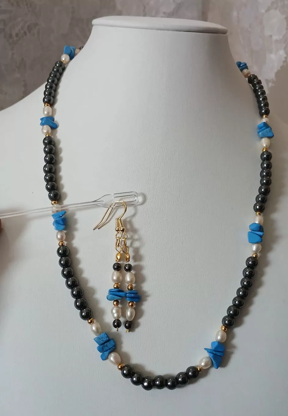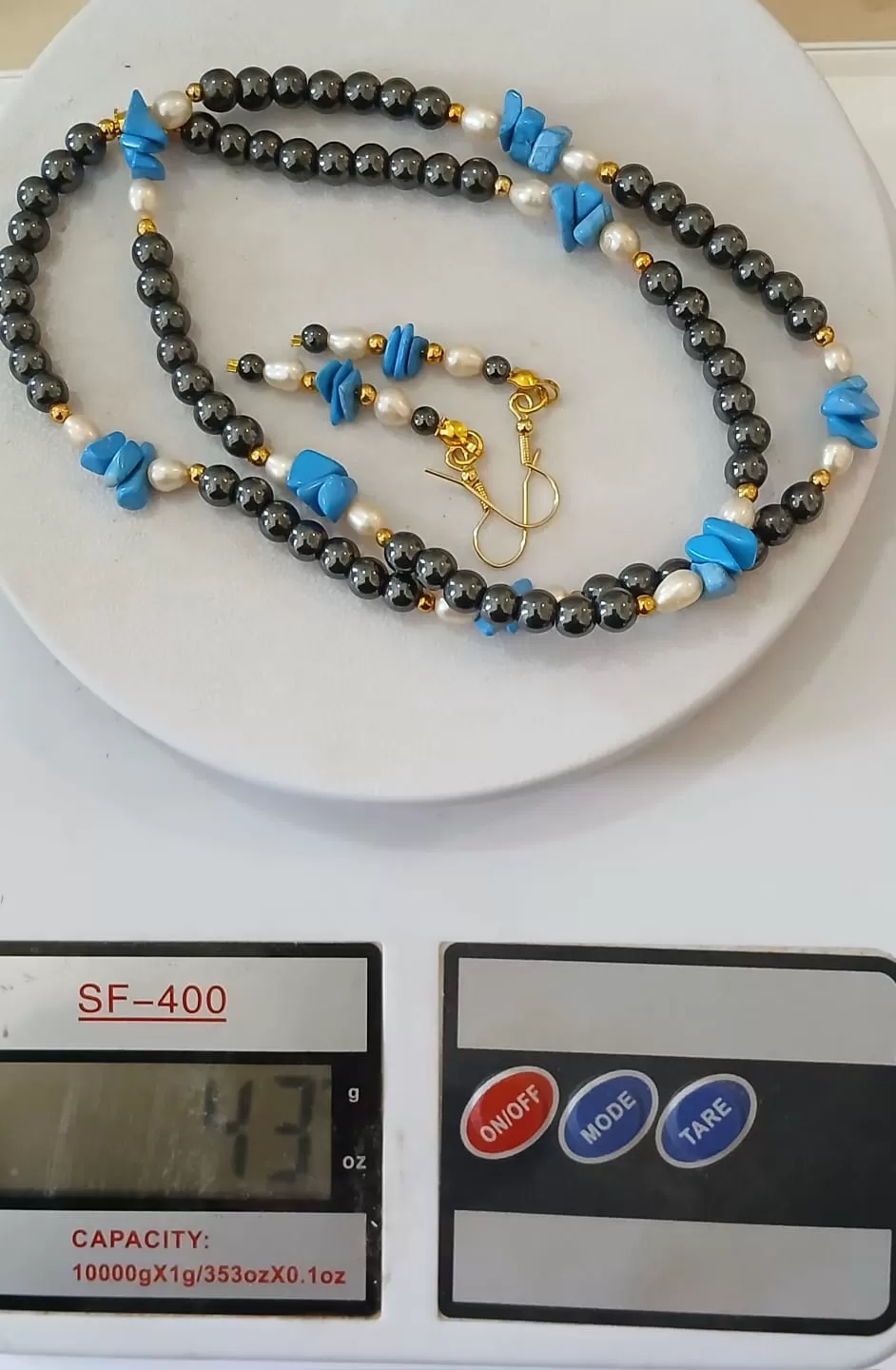 Colar de Pedras Naturais Howlita-Turquesa, Pérolas de Água Doce e Hematitas Lapidadas 5mm + Brinco Grátis.