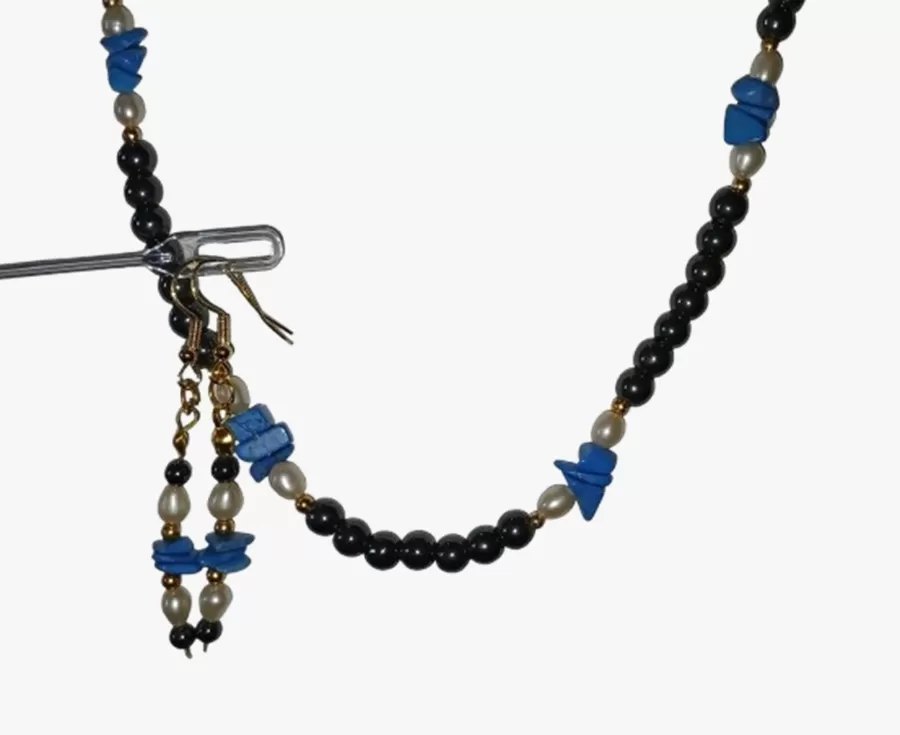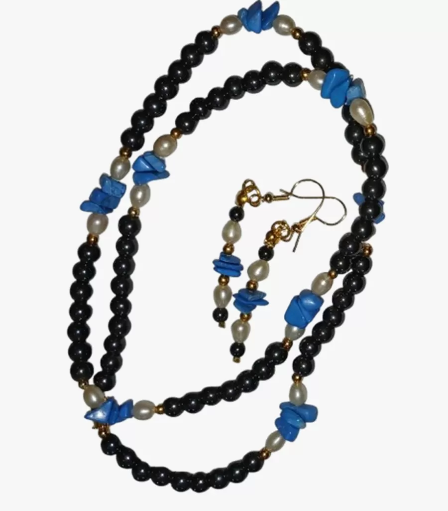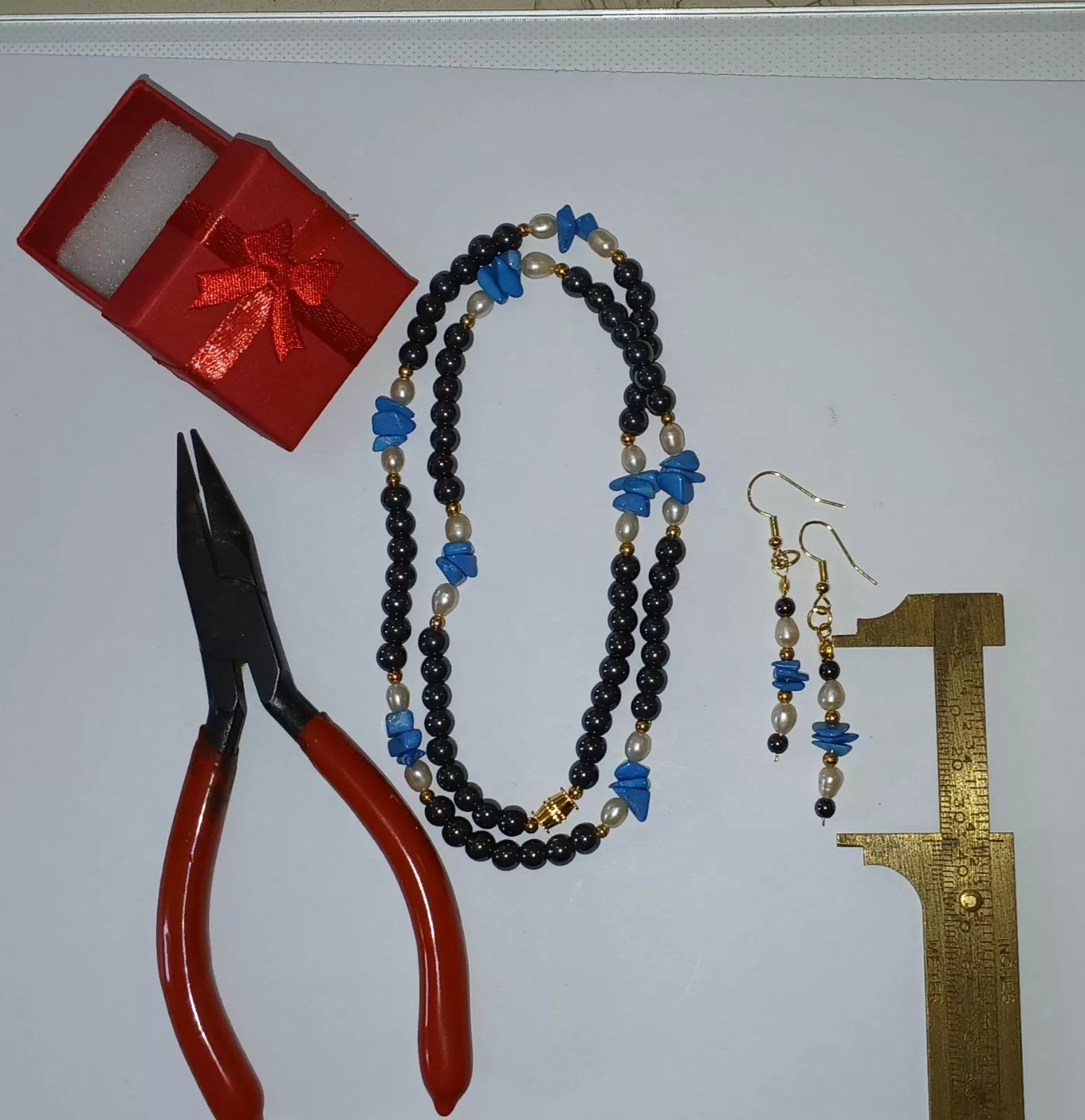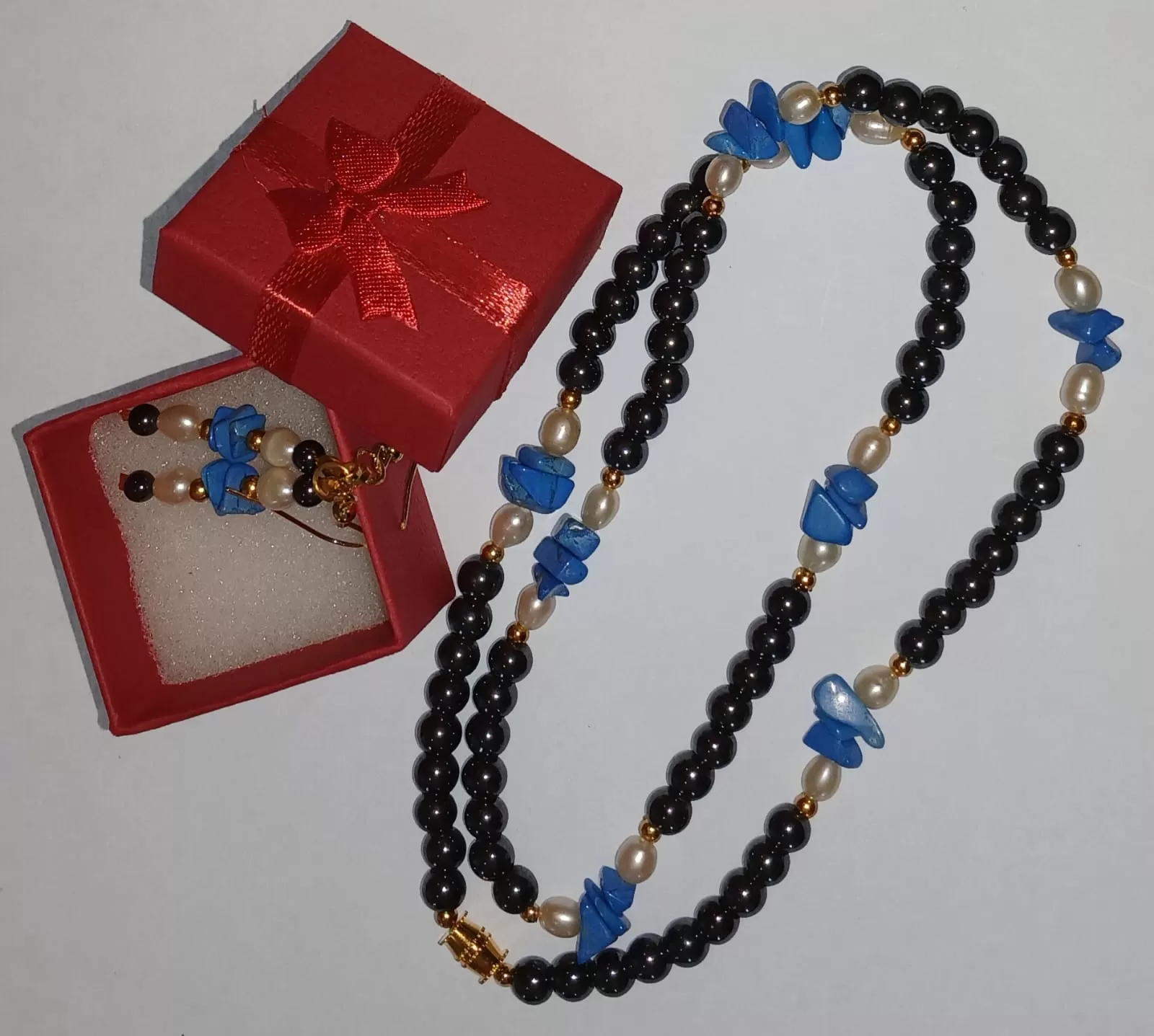Colar de Pedras Naturais Howlita-Turquesa, Pérolas de Água Doce e Hematitas Lapidadas 5mm + Brinco Grátis.