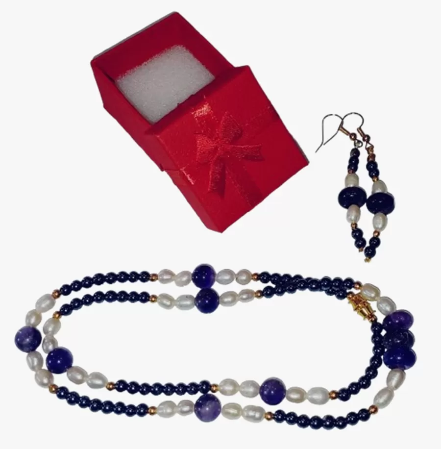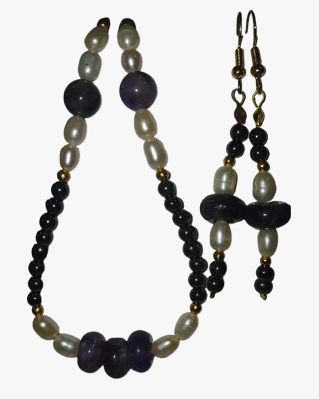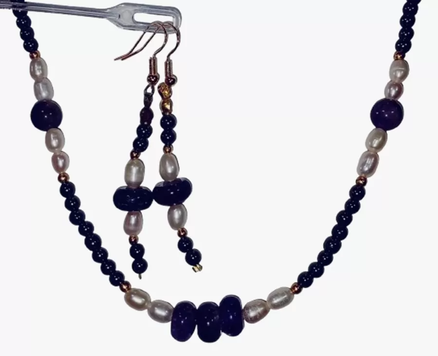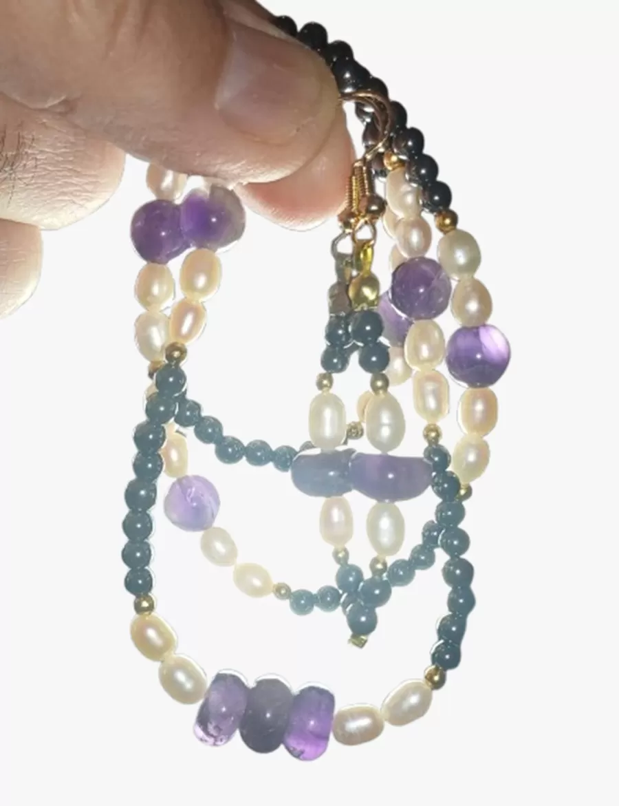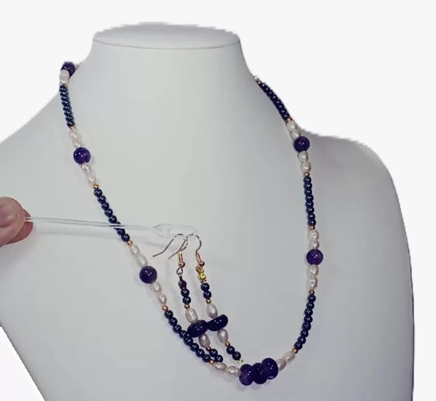 Colar Pedras Ametistas Lapidadas, Pérolas Naturais e Hematitas + Brinco Grátis
