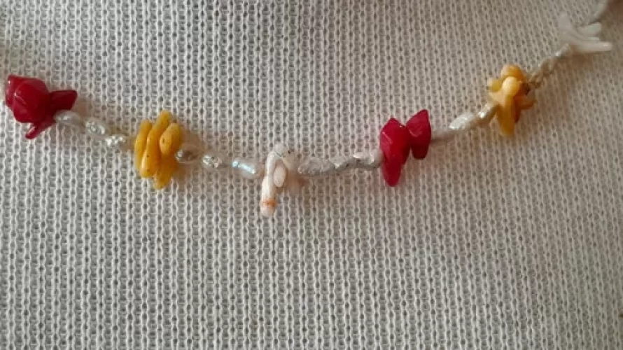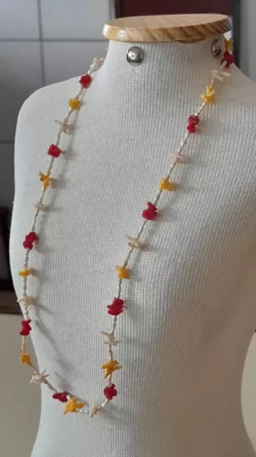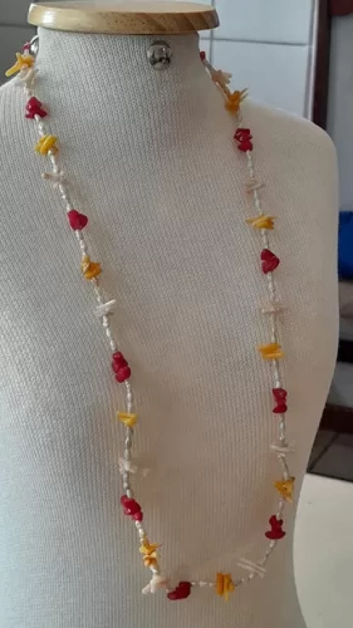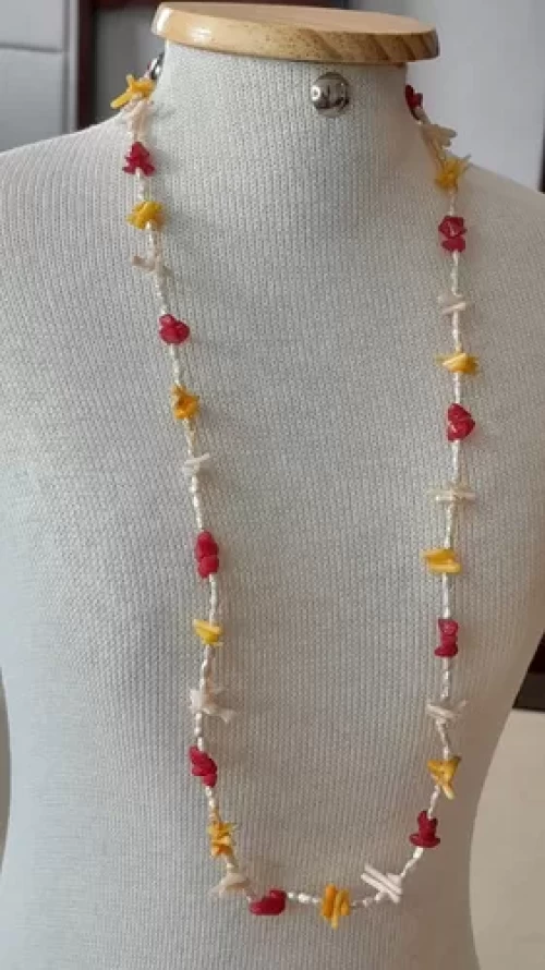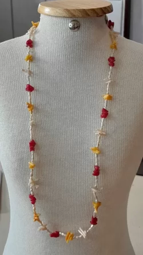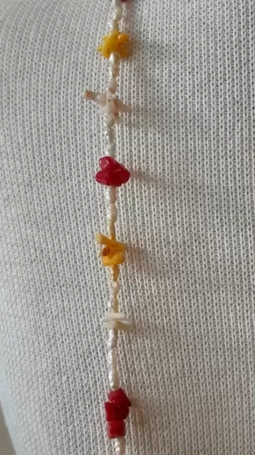 Colar de Pérolas Naturais Cultivadas Barrocas Arrozinho e Coral Cascalho Clarinho, Amarelo e Vermelho. Peça Única Exclusiva Confecção Própria Artesanal.
