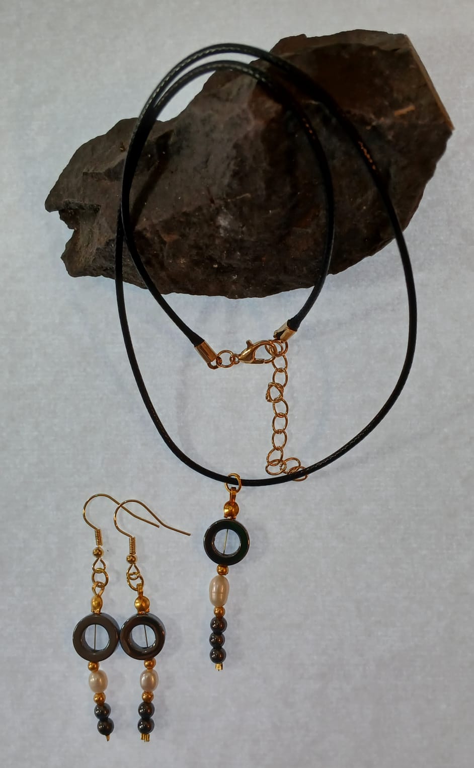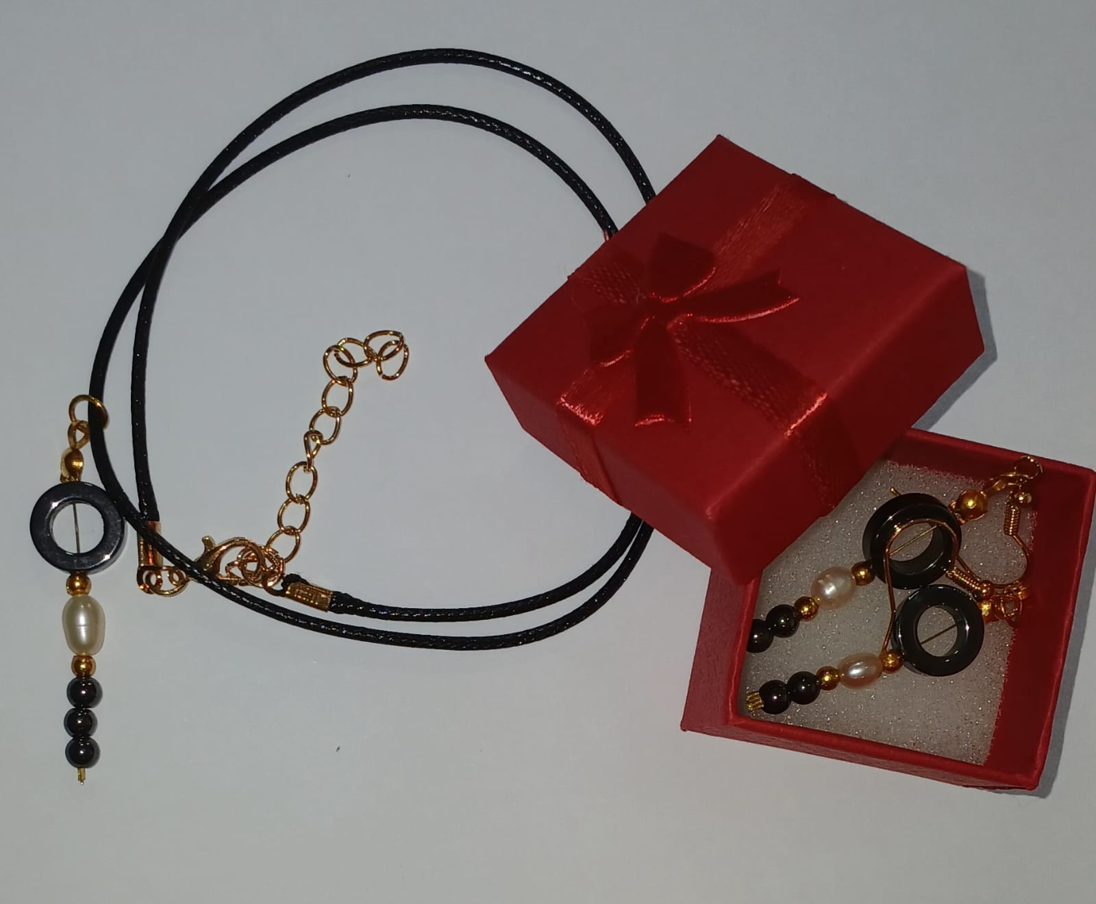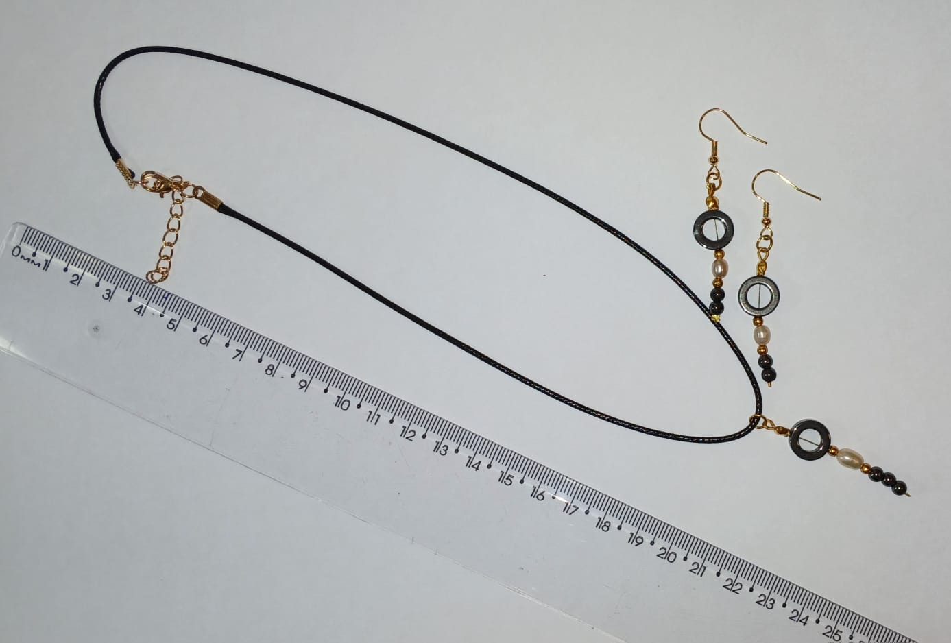 Colar Cordão Tipo Courinho com Pingente e Brincos em Pérolas Naturais e Hematitas (3mm e Disquinho), Fecho canoa.