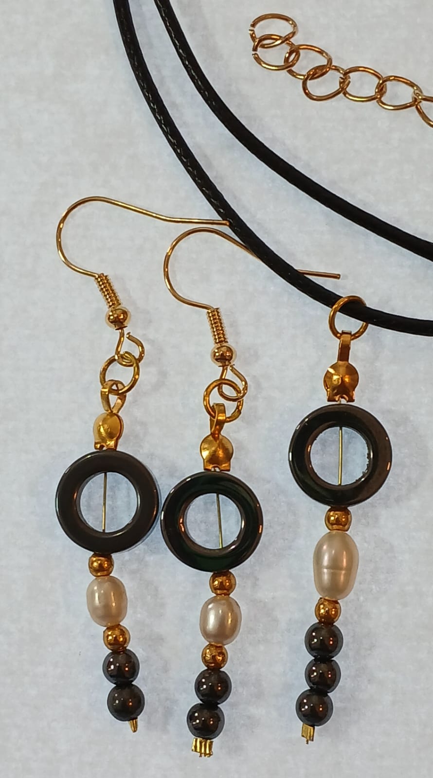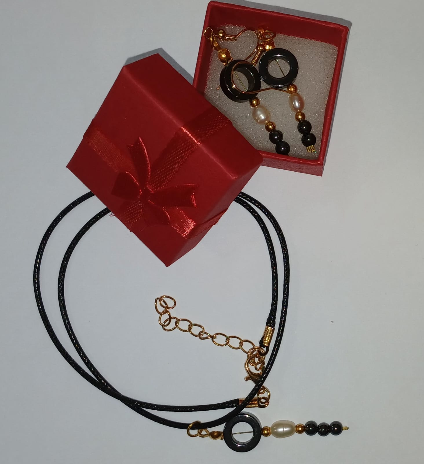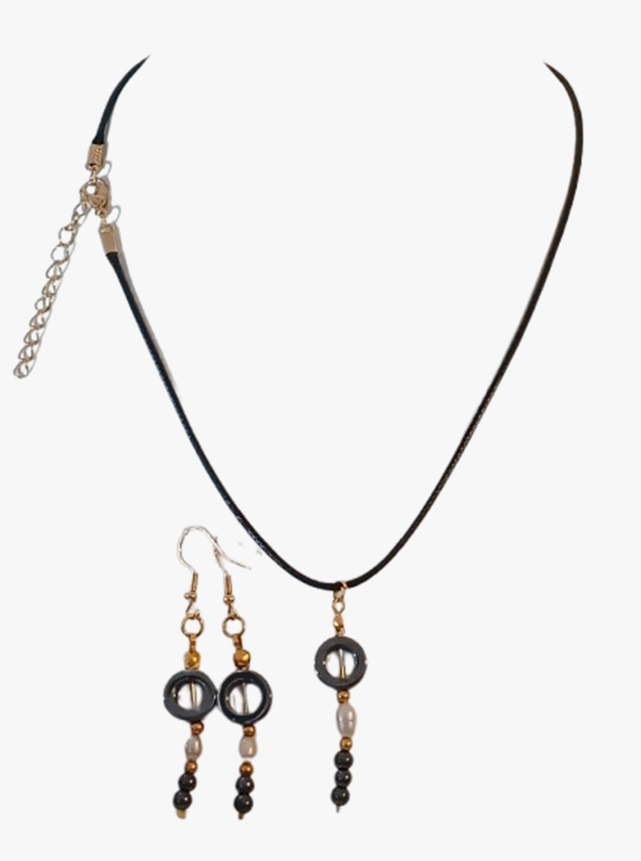 Colar Cordão Tipo Courinho com Pingente e Brincos em Pérolas Naturais e Hematitas (3mm e Disquinho), Fecho canoa.
