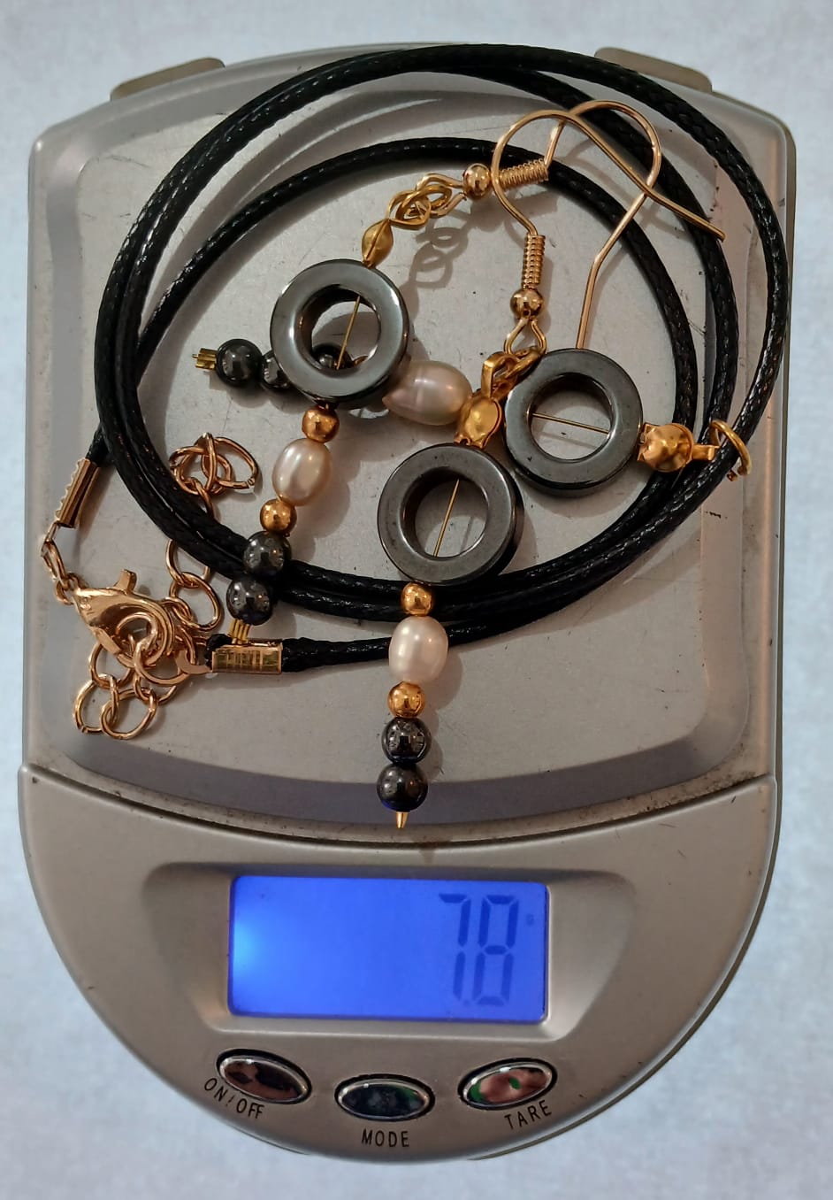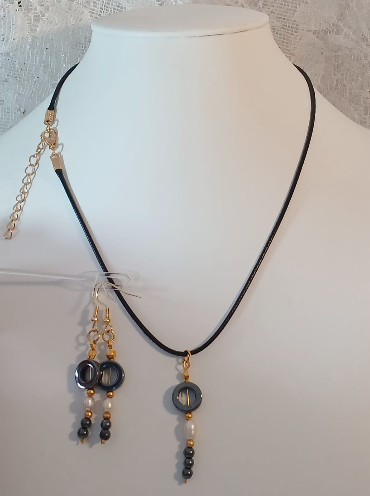 Colar Cordão Tipo Courinho com Pingente e Brincos em Pérolas Naturais e Hematitas. Fecho canoa.