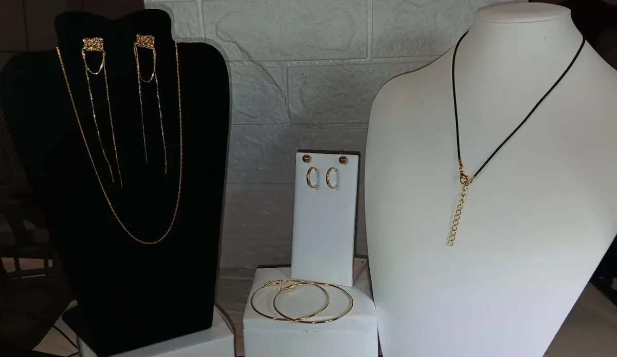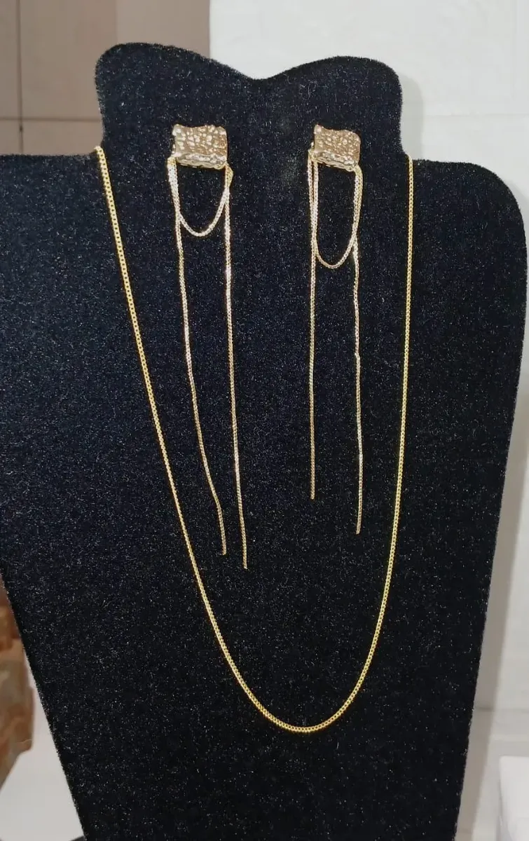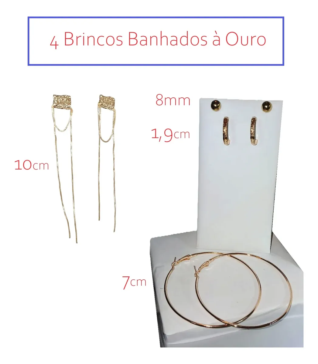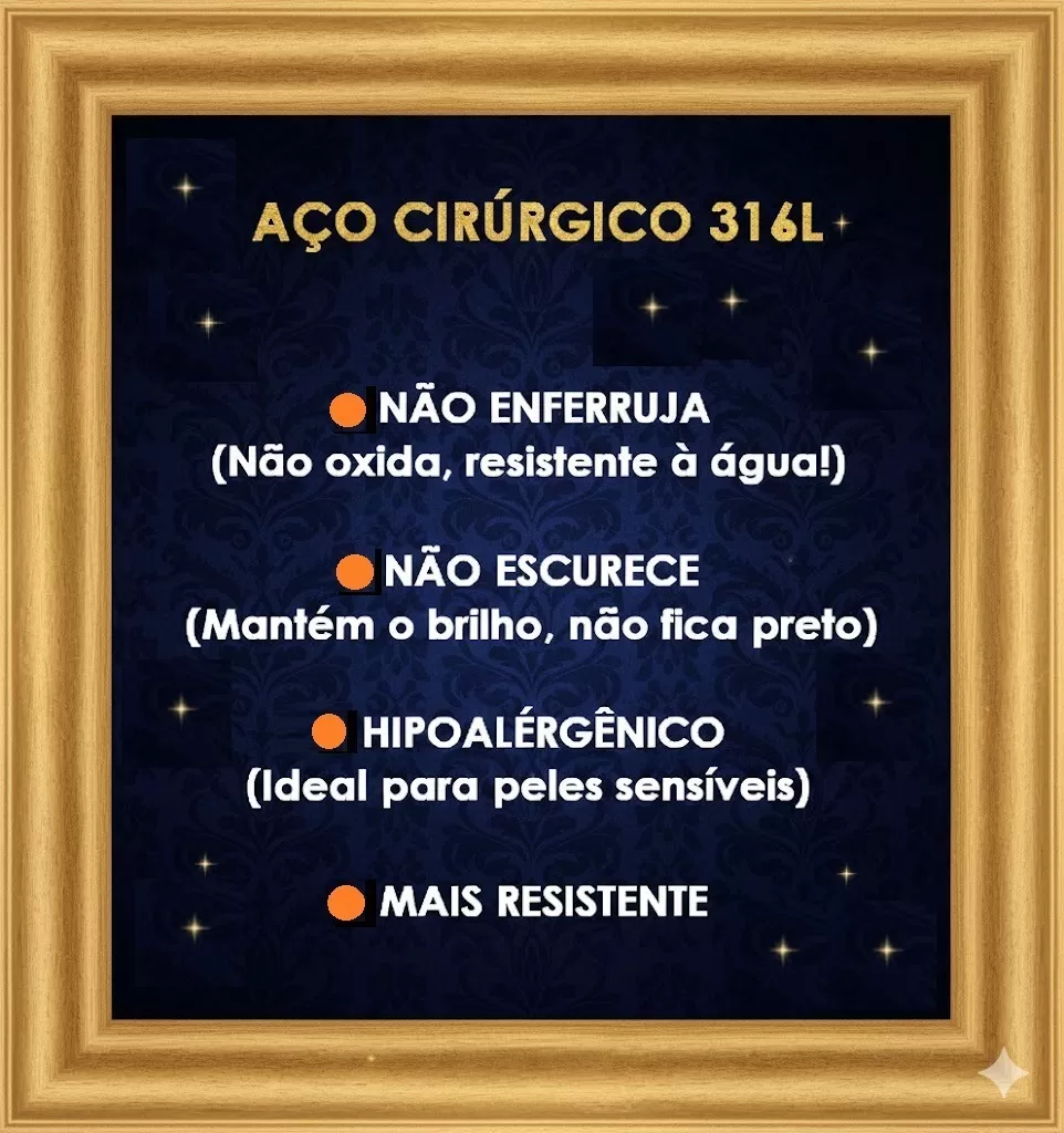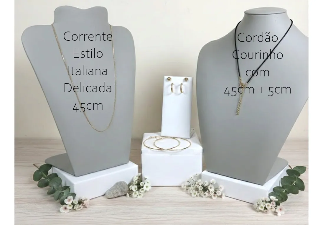 ATENÇÃO: FOTOS ORIGINAIS DAS PEÇAS, NÃO ACOMPANHAM BASE NEM OUTROS ENFEITES/PEDRAS/ADORNOS ADICIONADAS PARA FOTOS ARTÍSTICAS CRIADAS POR I.A. K877 KIT COM 6 PEÇAS em Aço 316L Banhado à Ouro – Corrente Fininha Delicada Estilo Italiano com 45cm – Cordão Tipo Courinho Preto 45cm + Prolongador 5cm – 4 Brincos: 10cm + Bolinha 8mm + Meia Argola 1,9cm e Argola Grande 7cm AÇO CIRÚRGICO 316L PETRA BRAZILIS 1. NÃO ESCURECE, NÃO OXIDA, oxigênio e a umidade, criam uma camada escura no metal (oxidação) 2. HIPOALERGÊNICO: ou seja, têm baixíssimo potencial de causar alergia, é o mesmo aço usado em cirurgias. 3. RESISTENTE À ÁGUA do mar, piscina, chuveiro e ao suor que tem sal/cloro. DICAS DE CONSERVAÇÃO Toda confecção de colares, brincos, pulseiras e outros, são feitos com materiais muito delicados, com partes metálicas delicadas. Cuidado com crianças que adoram puxar colares e brincos, animais que amam pular em seus donos e assim causarem quebras ou rompimentos. 1. Guarde suas SEMIJOIAS em embalagens livre de arranhões e riscos. 2. Longe de produtos Químicos. 3. Em local sem umidade. 4. Sem calor demasiado e longe da luz solar. 5. Guarde em saco de plástico cristal ou saquinho de veludo. Armazene cada SEMIJOIA em uma unidade diferente. 6. Nossa empresa, PETRA BRAZILIS, têm experiência em PEDRAS PRECIOSAS LAPIDADAS, MINERAIS DE COLEÇÃO, E SEMIJÓIAS a mais de 30 anos. Garantia do vendedor: 7 dias