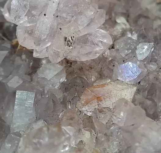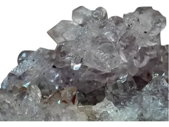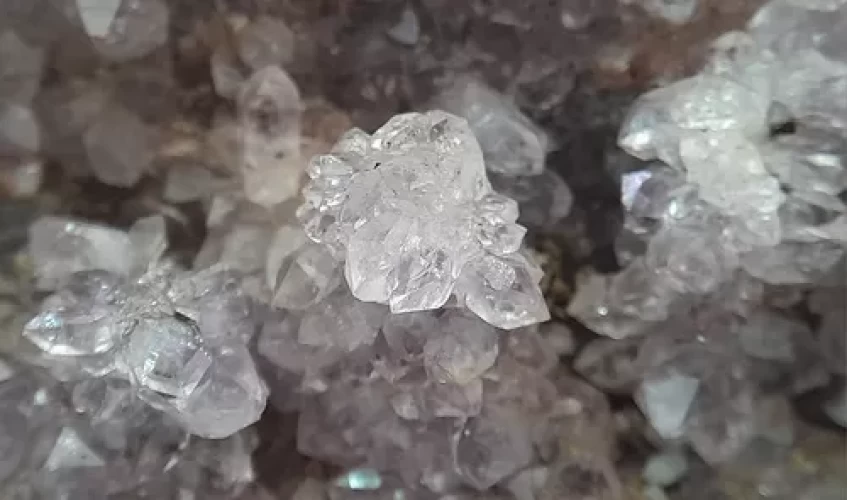Linda Drusa de Ametista com Várias Pinhas em Forma de Flor e Micro Arco-Íris (Fenômeno de Iridescência) em vários cristais. Alguns micro cristais com pontas Bi terminadas. Lupa de Aumento das Fotos Macro 20X.
