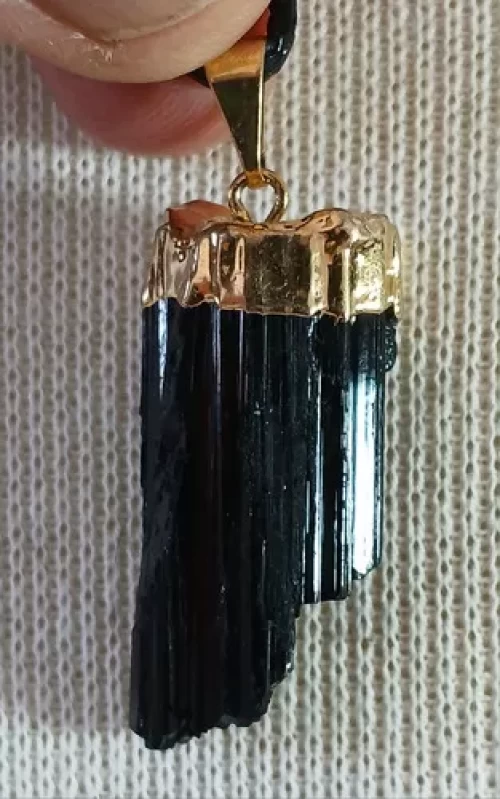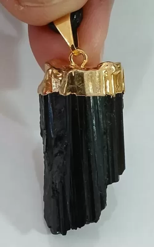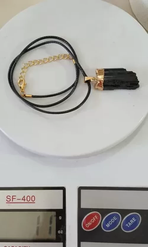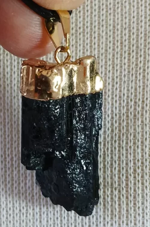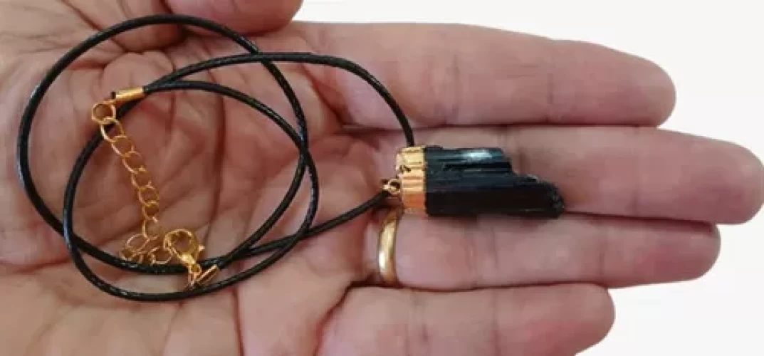 Colar Cordão Imita Courinho com Pingente DE TURMALINA PRETA com BANHO DE OURO. PEDRA TURMALINA PARA PROTEÇÃO.