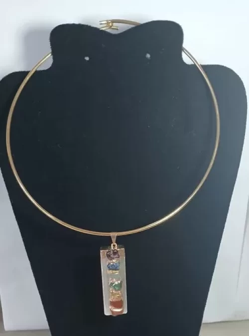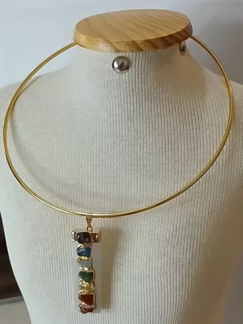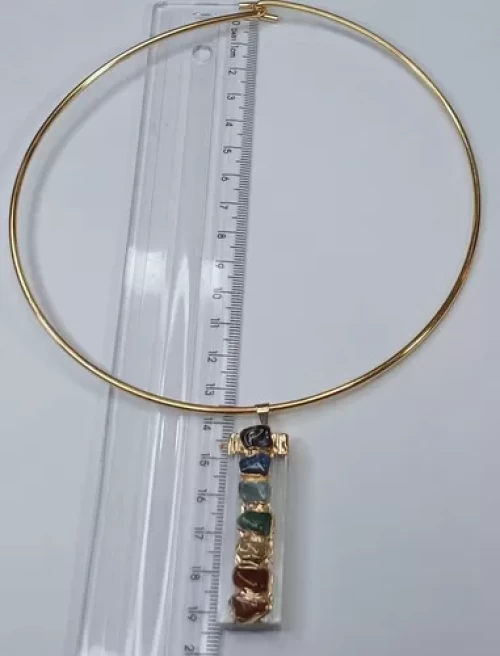 GARGANTILHA CHOKER DE FIO DOURADO COM PINGENTE SELENITA BRANCA E PEDRAS DOS CHAKRAS COM BANHO DE OURO.