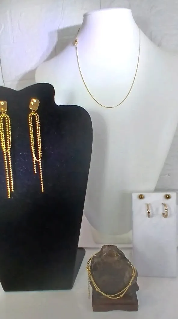 ATENÇÃO: FOTOS ORIGINAIS DAS PEÇAS, NÃO ACOMPANHAM BASE NEM OUTROS ENFEITES/PEDRAS/ADORNOS ADICIONADAS PARA FOTOS ARTÍSTICAS CRIADAS POR I.A. Kit 5 Peças Banhadas à Ouro, Uma Corrente Delicada Fininha, Aberta 44cm e Fechada 22cm, 3 Brincos e uma Pulseira duas voltas com delicadas bolinhas. Cód. K870 Tamanhos aproximados do comprimento das peças: Corrente: 22cm Fechada e 44cm Aberta Brinco 1: comprimento 12cm fecho com silicone Brinco 2 Esfera Bolinha 7mm (0,7cm) fecho com silicone Brinco 3: 17mm (1,7cm) fecho com silicone Pulseira Aberta: 16cm + prolongador 5cm Peças fabricadas em Aço Cirúrgico 316L e banhadas à Ouro, entre 2 a 3u. DICAS DE CONSERVAÇÃO Toda confecção de colares, brincos, pulseiras e outros, são feitos com materiais muito delicados, com partes metálicas delicadas. Cuidado com crianças que adoram puxar colares e brincos, animais que amam pular em seus donos e assim causarem quebras ou rompimentos. 1. Guarde suas SEMIJOIAS em embalagens livre de arranhões e riscos. 2. Longe de produtos Químicos. 3. Em local sem umidade. 4. Sem calor demasiado e longe da luz solar. 5. Guarde em saco de plástico cristal ou saquinho de veludo. Armazene cada SEMIJOIA em uma unidade diferente. 6. Nossa empresa, PETRA BRAZILIS, têm experiência em PEDRAS PRECIOSAS LAPIDADAS, MINERAIS DE COLEÇÃO, E SEMIJÓIAS a mais de 30 anos. Garantia do vendedor: 7 dias