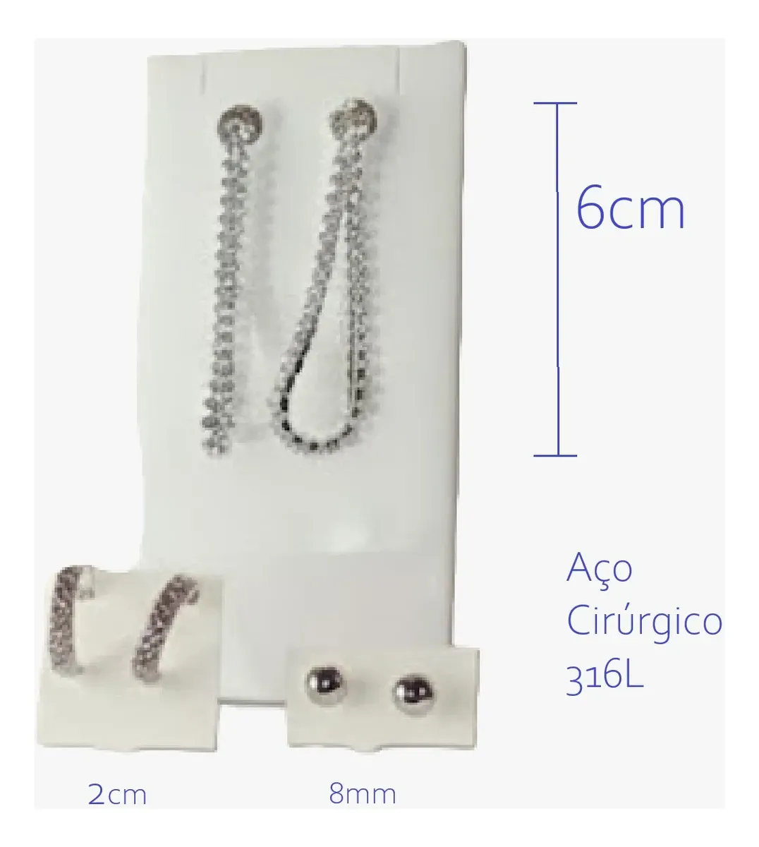 ATENÇÃO: FOTOS ORIGINAIS DAS PEÇAS, NÃO ACOMPANHAM BASE NEM OUTROS ENFEITES/PEDRAS/ADORNOS ADICIONADAS PARA FOTOS ARTÍSTICAS CRIADAS POR I.A. K875 KIT COM 4 brincos: 1. Comprimento Aprox. 10cm 2. Com Strass Comprimento Aprox. 6cm 3. Bolinha de 8mm 4. Meia Argola Aprox. 1,9cm AÇO CIRÚRGICO 316L PETRA BRAZILIS 1. NÃO ESCURECE, NÃO OXIDA, oxigênio e a umidade, criam uma camada escura no metal (oxidação) 2. HIPOALERGÊNICO: ou seja, têm baixíssimo potencial de causar alergia, é o mesmo aço usado em cirurgias. 3. RESISTENTE À ÁGUA do mar, piscina, chuveiro e ao suor que tem sal/cloro. DICAS DE CONSERVAÇÃO Toda confecção de colares, brincos, pulseiras e outros, são feitos com materiais muito delicados, com partes metálicas delicadas. Cuidado com crianças que adoram puxar colares e brincos, animais que amam pular em seus donos e assim causarem quebras ou rompimentos. 1. Guarde suas SEMIJOIAS em embalagens livre de arranhões e riscos. 2. Longe de produtos Químicos. 3. Em local sem umidade. 4. Sem calor demasiado e longe da luz solar. 5. Guarde em saco de plástico cristal ou saquinho de veludo. Armazene cada SEMIJOIA em uma unidade diferente. 6. Nossa empresa, PETRA BRAZILIS, têm experiência em PEDRAS PRECIOSAS LAPIDADAS, MINERAIS DE COLEÇÃO, E SEMIJÓIAS a mais de 30 anos. Garantia do vendedor: 7 dias