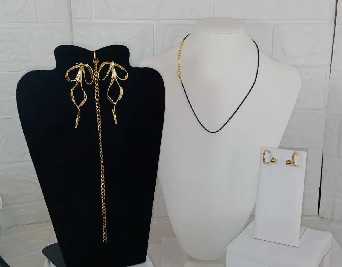 KIT COM CINCO PEÇAS: UM CORDÃO TIPO COURINHO COM 45cm + 5cm DE ALONGADOR, fecho dourado Mosquetão Uma Pulseira TRÊS BRINCOS TODAS PEÇAS EM AÇO CIRÚRGICO 316L FOLHEADOS À OURO, 2A 3u. ATENÇÃO: FOTOS ORIGINAIS DAS PEÇAS, NÃO ACOMPANHAM BASE NEM OUTROS ENFEITES/PEDRAS/ADORNOS ADICIONADAS PARA FOTOS ARTÍSTICAS CRIADAS POR I.A. DICAS DE CONSERVAÇÃO Toda confecção de colares, brincos, pulseiras e outros, são feitos com materiais muito delicados, com partes metálicas delicadas. Cuidado com crianças que adoram puxar colares e brincos, animais que amam pular em seus donos e assim causarem quebras ou rompimentos. 1. Guarde suas SEMIJOIAS em embalagens livre de arranhões e riscos. 2. Longe de produtos Químicos. 3. Em local sem umidade. 4. Sem calor demasiado e longe da luz solar. 5. Guarde em saco de plástico cristal ou saquinho de veludo. Armazene cada SEMIJOIA em uma unidade diferente. 6. Nossa empresa, PETRA BRAZILIS, têm experiência em PEDRAS PRECIOSAS LAPIDADAS, MINERAIS DE COLEÇÃO, E SEMIJÓIAS a mais de 30 anos. Garantia do vendedor: 7 dias