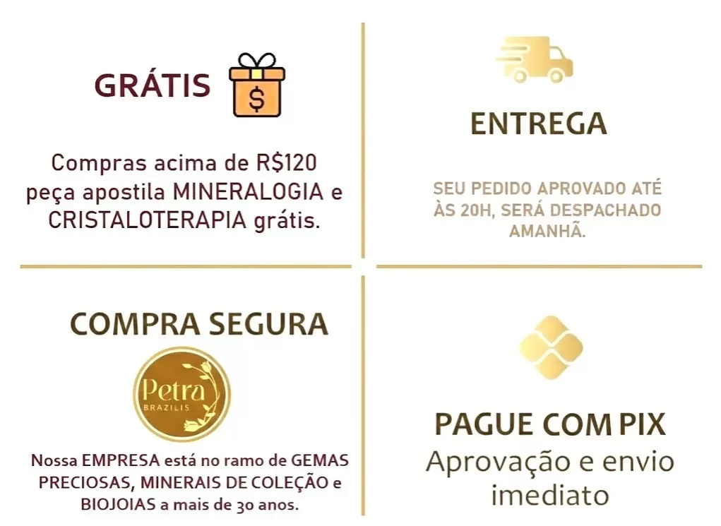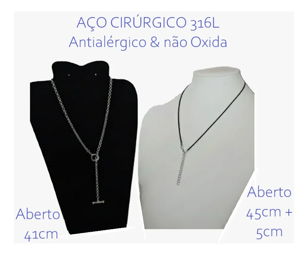 ATENÇÃO: FOTOS ORIGINAIS DAS PEÇAS, NÃO ACOMPANHAM BASE NEM OUTROS ENFEITES/PEDRAS/ADORNOS ADICIONADAS PARA FOTOS ARTÍSTICAS CRIADAS POR I.A. KIT COM 6 PEÇAS: – Corrente/Gargantilha/Choker com fechamento na frente Estilo Italiana Aberto 41cm – Cordão tipo courinho Aberto com 45cm + 5cm prolongador. – 4 Brincos: 10cm + 2cm + 8mm + 1,4cm AÇO CIRÚRGICO 316L PETRA BRAZILIS 1. NÃO ESCURECE, NÃO OXIDA, oxigênio e a umidade, criam uma camada escura no metal (oxidação) 2. HIPOALERGÊNICO: ou seja, têm baixíssimo potencial de causar alergia, é o mesmo aço usado em cirurgias. 3. RESISTENTE À ÁGUA do mar, piscina, chuveiro e ao suor que tem sal/cloro. DICAS DE CONSERVAÇÃO Toda confecção de colares, brincos, pulseiras e outros, são feitos com materiais muito delicados, com partes metálicas delicadas. Cuidado com crianças que adoram puxar colares e brincos, animais que amam pular em seus donos e assim causarem quebras ou rompimentos. 1. Guarde suas SEMIJOIAS em embalagens livre de arranhões e riscos. 2. Longe de produtos Químicos. 3. Em local sem umidade. 4. Sem calor demasiado e longe da luz solar. 5. Guarde em saco de plástico cristal ou saquinho de veludo. Armazene cada SEMIJOIA em uma unidade diferente. 6. Nossa empresa, PETRA BRAZILIS, têm experiência em PEDRAS PRECIOSAS LAPIDADAS, MINERAIS DE COLEÇÃO, E SEMIJÓIAS a mais de 30 anos. Garantia do vendedor: 7 dias