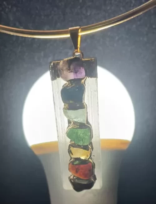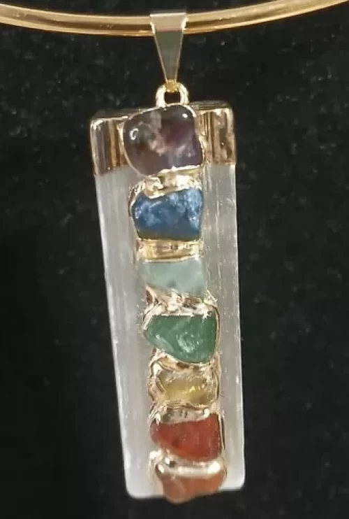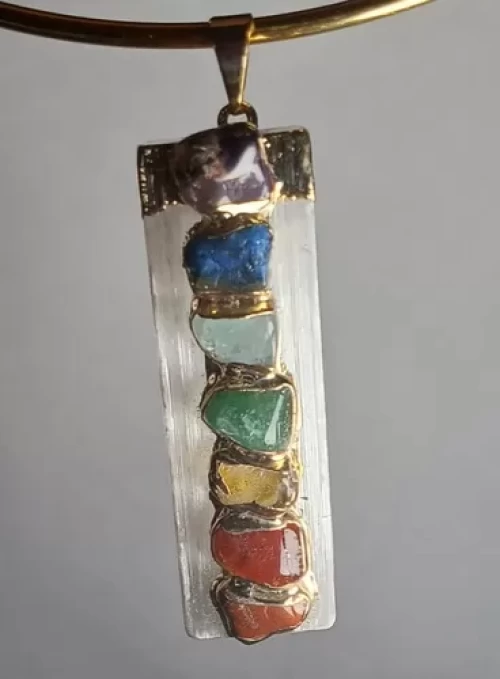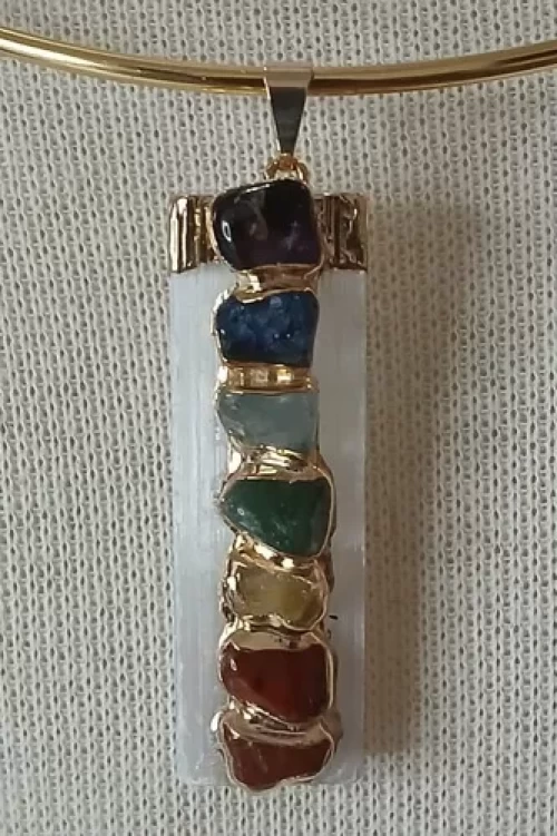 PINGENTE SELENITA BRANCA COM 7 PEDRAS DOS CHAKRAS, BANHO DE OURO.