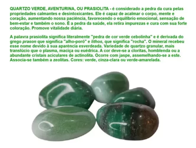 CRISTALOGRAFIA BENEFÍCIOS: É um cristal para ser utilizado no chakra do coração. A cor verde é calmante, desinfetante e desintoxicante. Colocado sobre a altura do coração, acalma o coração, alivia o stress, traz equilíbrio para o organismo, devolve o ritmo cardíaco, proporciona paz mental e espiritual.