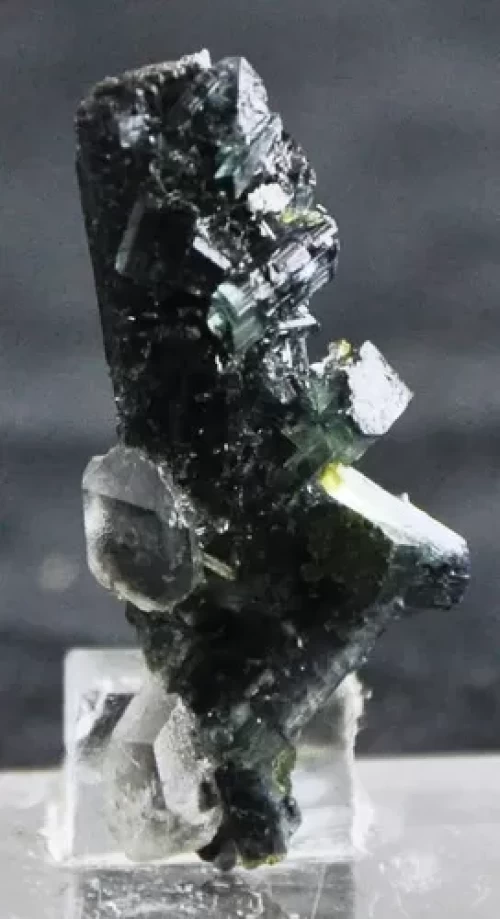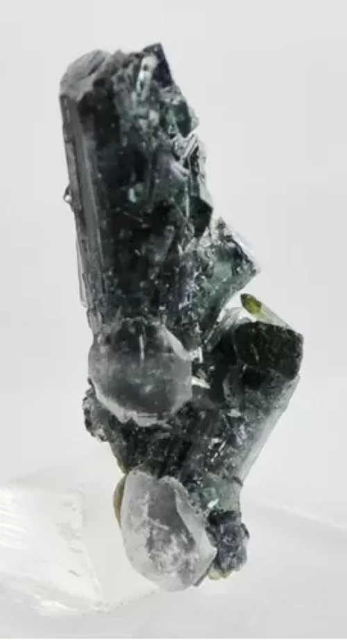 MAGNÍFICO SPÉCIMEN DE COLEÇÃO TURMALINAS CRISTAIS PRETOS, AZUIS e verdes COM INCLUSÃO DE QUARTZO BITERMINADO COLLECTION BLUE AND BLACK TOURMALINE WITH QUARTZ BI-FINESHED